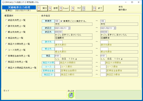 ●納品先別・請求先別・帳合先別・商品別など各種分類での数量・重量・数量平均単価・重量平均単価を集計します。